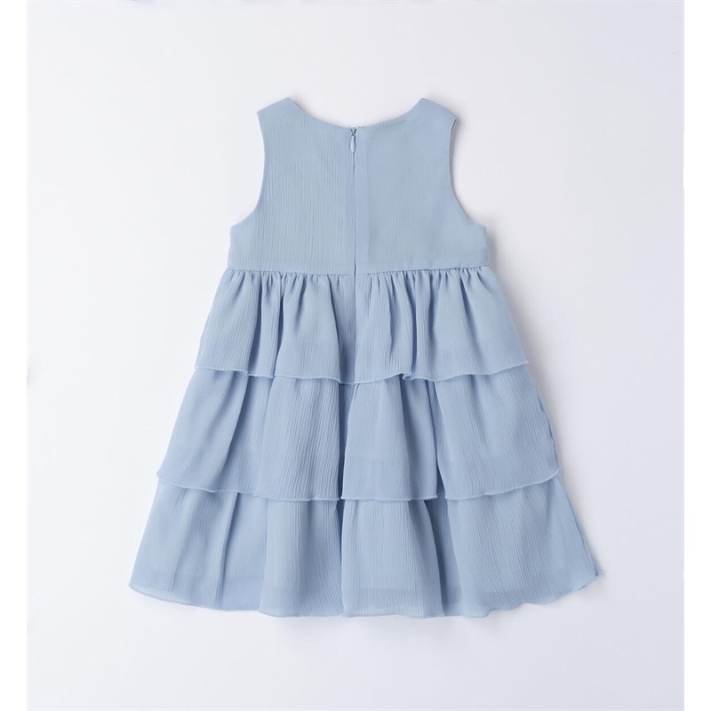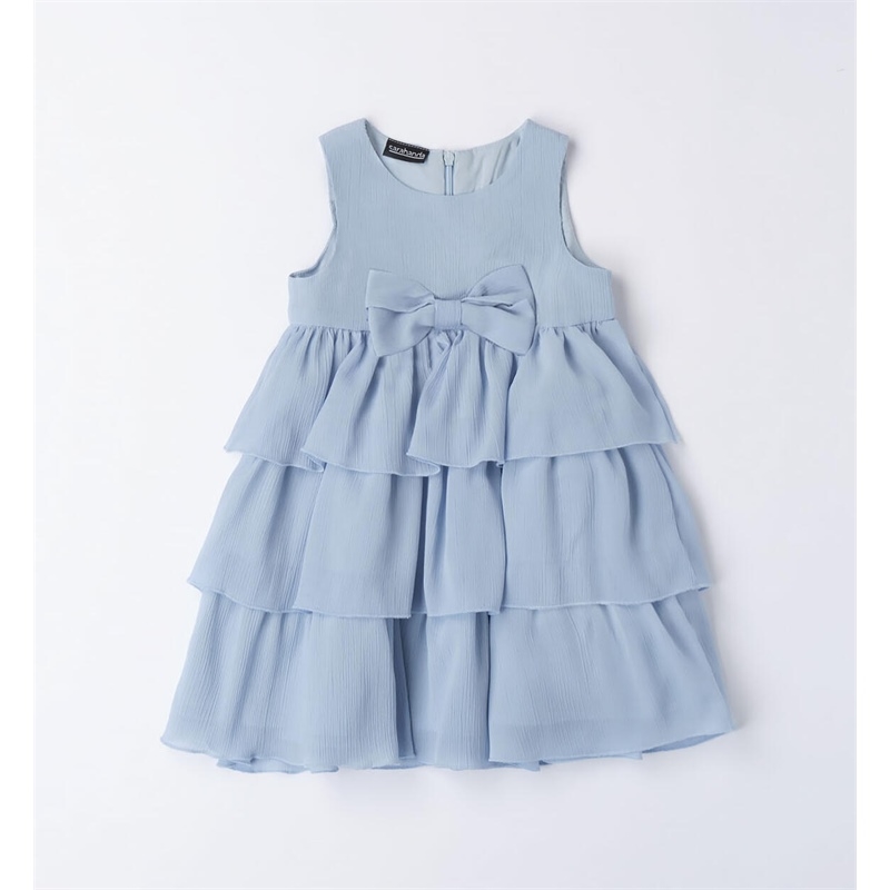 Abito Sarabanda per bambina smanicato ralizzato in voile, a balze, con fiocco. Fodera in cotone, lunghezza sopra al ginocchio e apertura dietro la schiena con zip invisibile