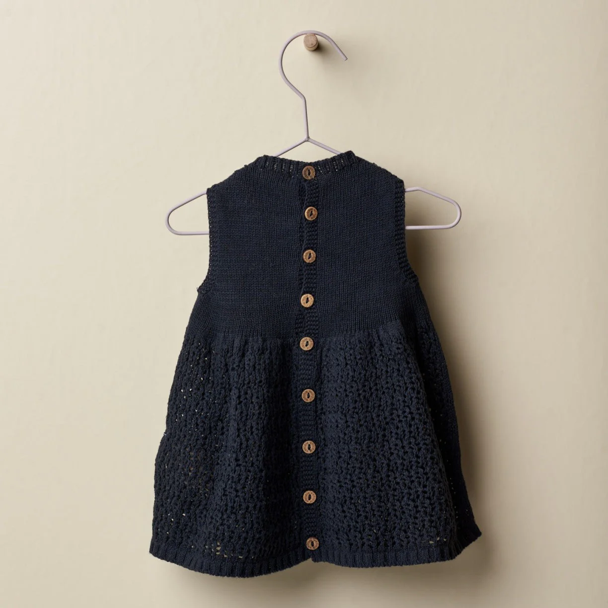 Abito con maniche ad aletta lavorato a maglia in un bellissimo cotone morbido, ottimo per bambine, fino a 24 mesi. L’abito in maglia NAMIB DESERT si chiude con bottoni in legno. Prodotto in Wholegarment, pezzo unico senza cuciture, per il massimo comfort del tuo bambino.