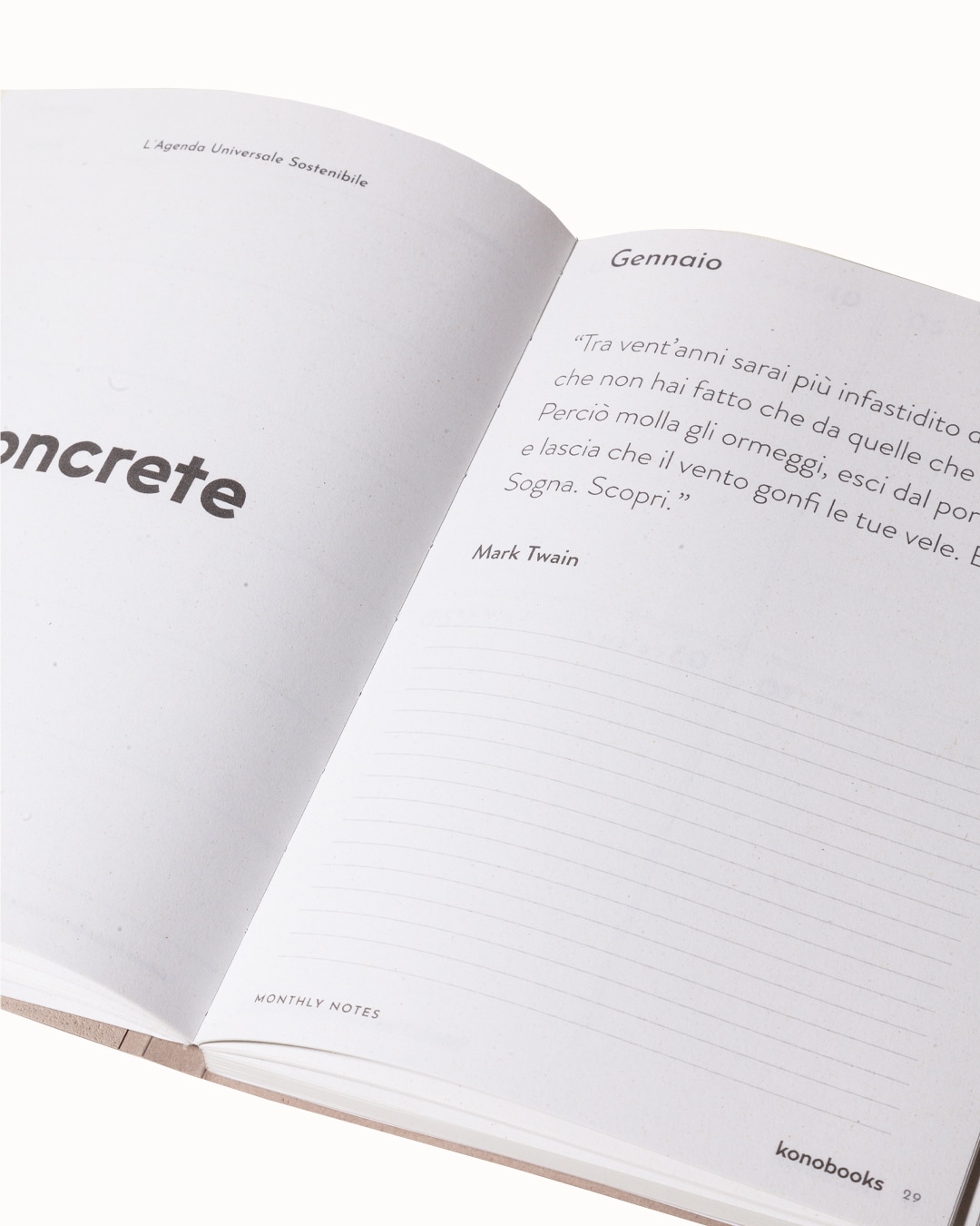 Konobooks ha deciso pertanto di produrre solo agende Universali con giorni personalizzabili che si possono acquistare in qualsiasi momento dell’anno cosi da evitare gli sprechi ed essere valide in tutti mesi.