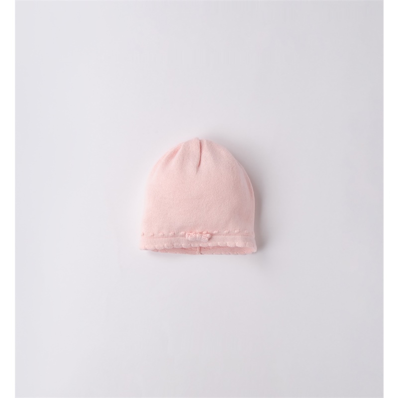 Cappello neonata in lana e cotone con fiocchetto centrale.
