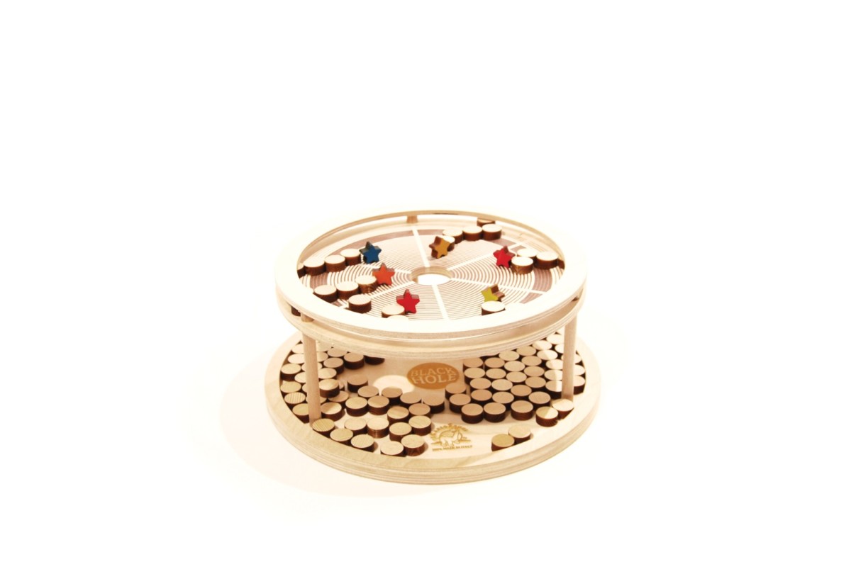 Il Black Hole è un gioco di precisione e pazienza. Vince chi riesce a spedire la propria stella nel buco nero prima degli avversari, spingendola con “la forza” dei pianeti. Si gioca da 2 fino a 6 giocatori. Materiale: Betulla Ogni giocatore ha una stella colorata da mandare dentro il buco nero tramite la spinta che riceve dalle pedine-pianeti che ha a disposizione. Vince chi per primo riesce a raggiungere l’obiettivo, ma se nel tentativo manda nel buco nero la stella di un avversario, regala a quest’ultimo la vittoria.