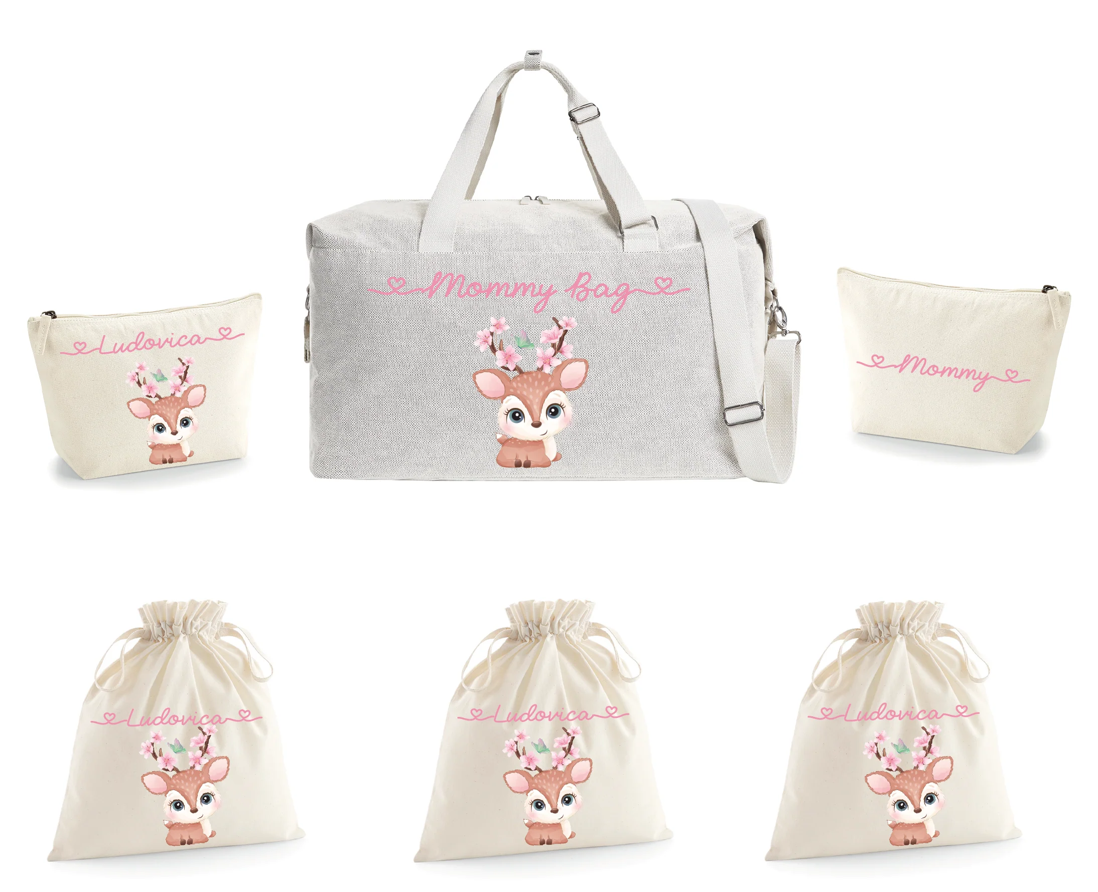 Borsone parto 2 pochette e 3 sacchi in cotone organico Cerbiatta fiori di Pesco
