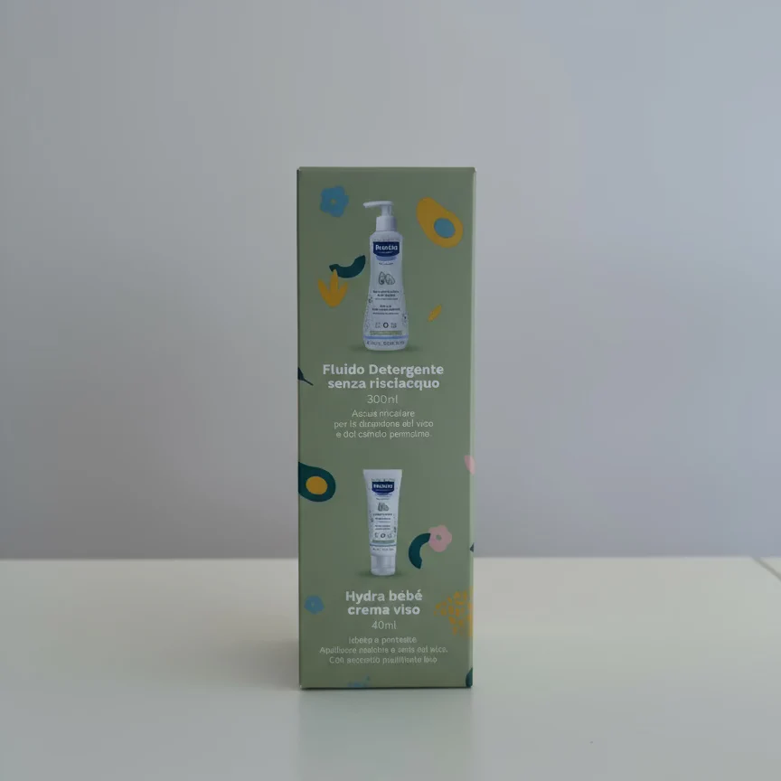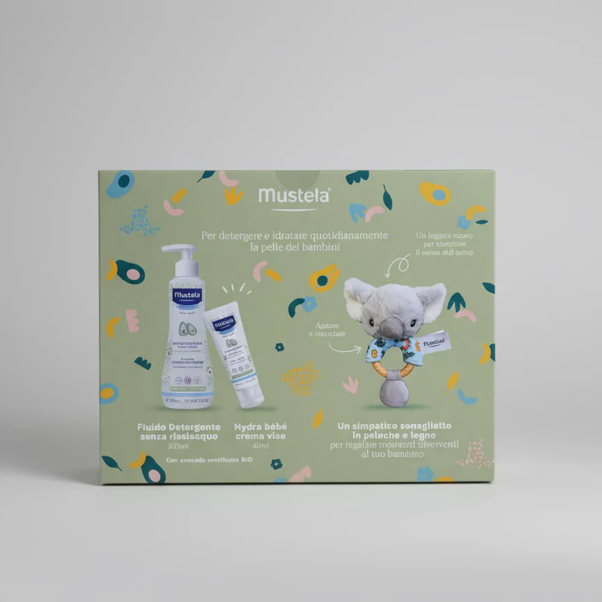 Formato Mustela Cofanetto Porta Ciuccio Welcome Baby che include: 1 Fluido Detergente senza risciacquo: Flacone da 300 ml. 1 hydra bebè crema viso: Tubo da 40 ml. 1 Sonaglio Koala