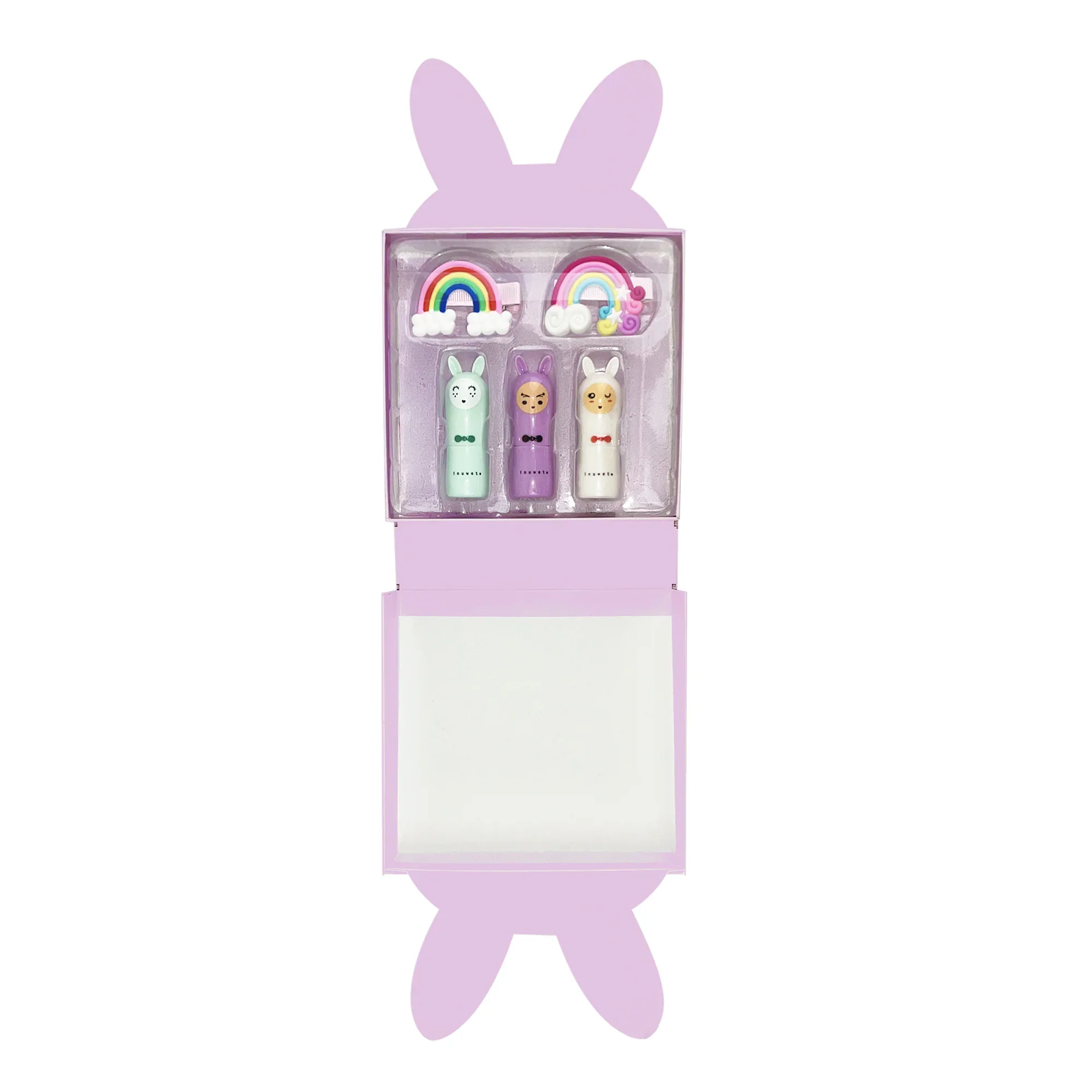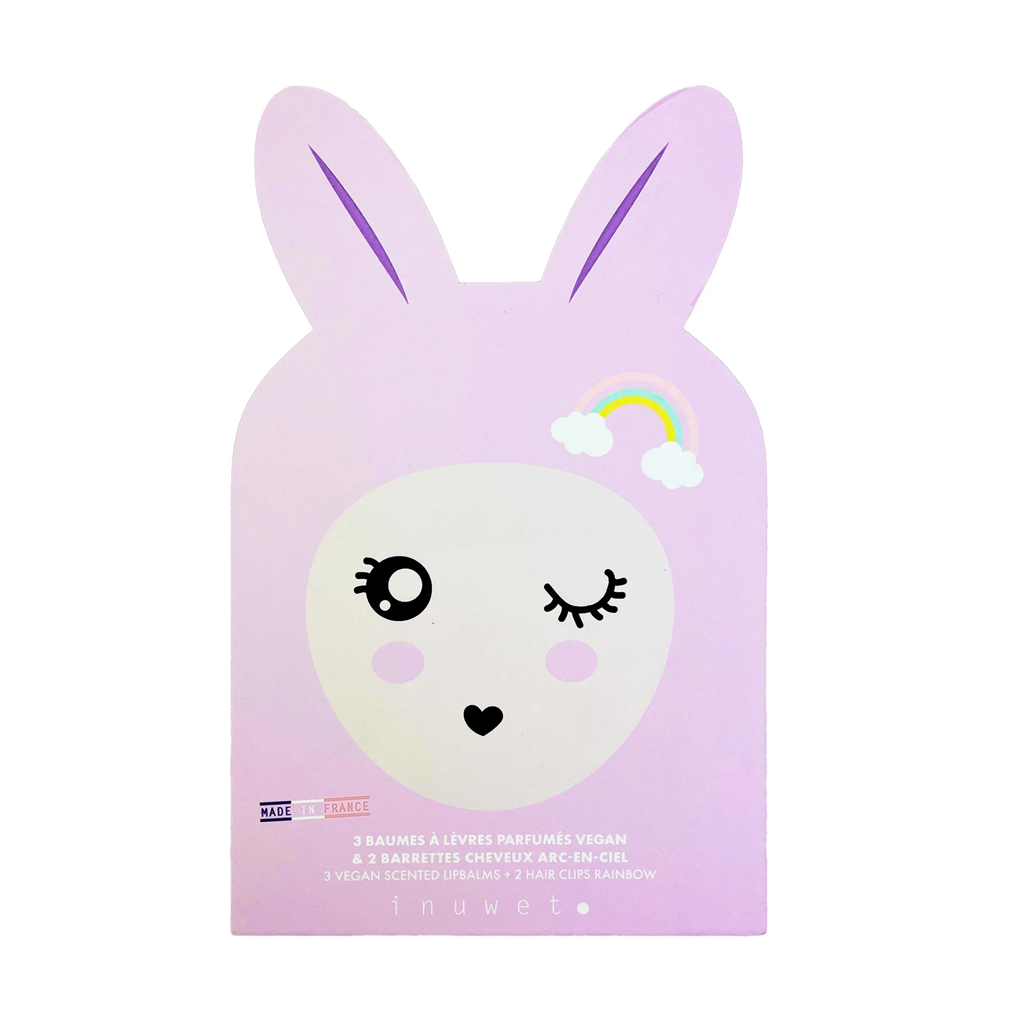 un’adorabile scatola a forma di coniglio, un’icona Inuwet, che potrai conservare per custodire i tuoi tesori! include 2 clip per capelli arcobaleno e 3 balsami per labbraprofumati