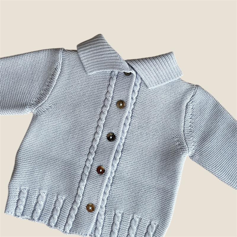 Questo completo neonato è realizzato in Pura Lana Merinos certificata Oeko-Tex 100 classe prima. E’ composto da un maglioncino con colletto, un pantalone in maglia con piedino e un cappellino