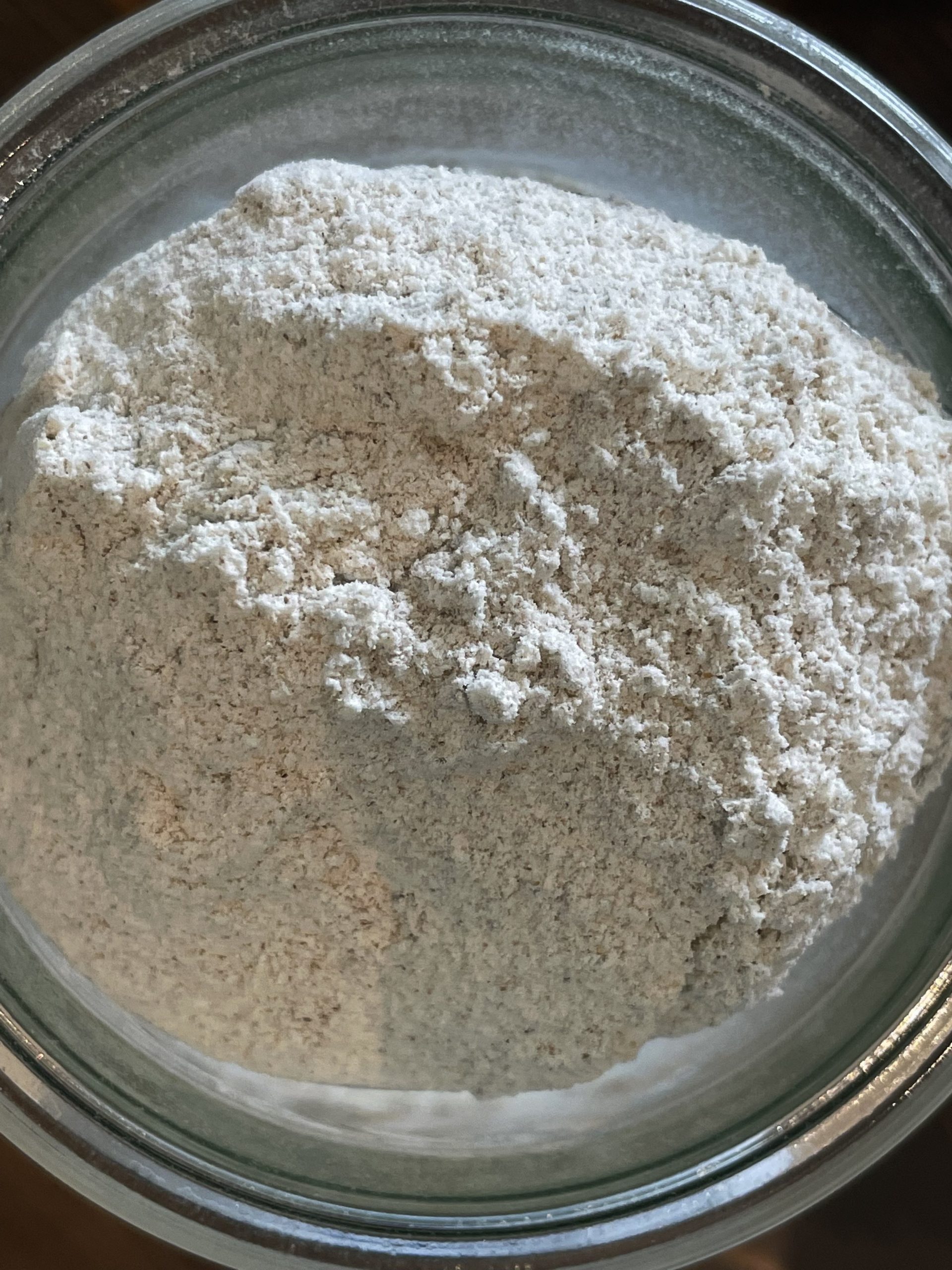 Unire la farina, l’amido, sale, pepe, lievito e odori e mescolare le polveri.