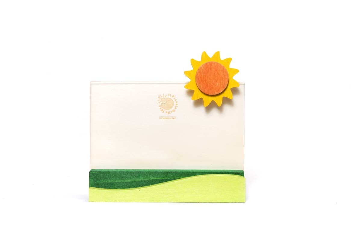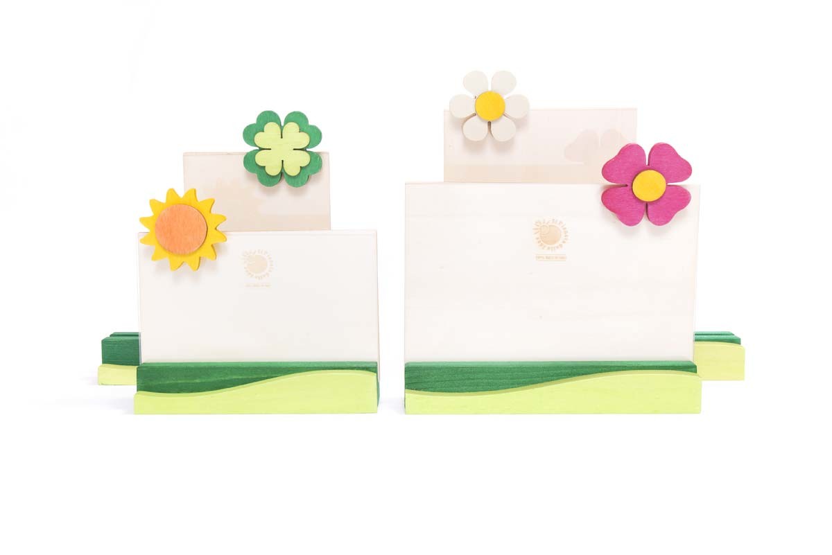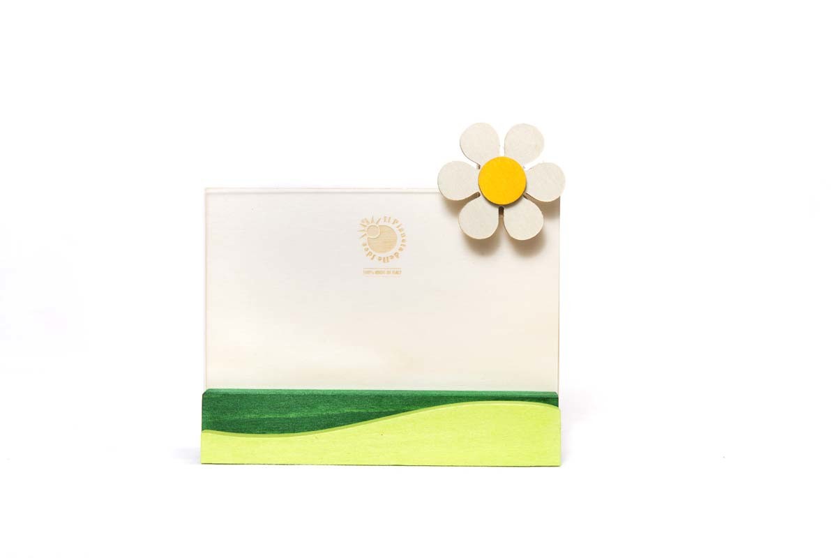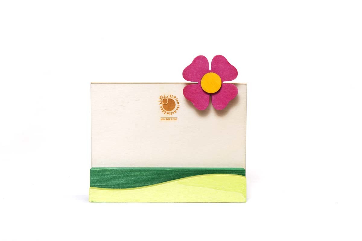 Portafoto in legno con protezione in plexiglass per custodire e mettere in mostra le persone e i momenti più importanti della vita. Scegli il fiore che preferisci tra il girasole, la margherita, il quadrifoglio e la viola. Materiali: legni di pioppo e abete – plexiglass Dimensioni: cm 14×15 Formato foto: cm 10×15