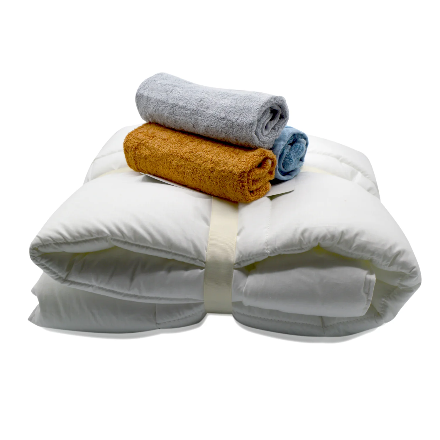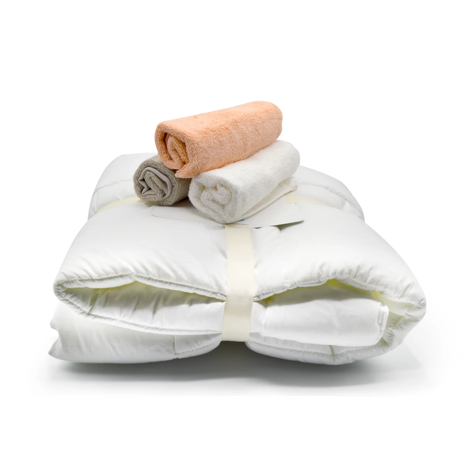 Questa Beybe Box Include: 1 Piumino bianco in cotone percalle 100 x 135 cm 3 Asciugamani in bambรน 50×25