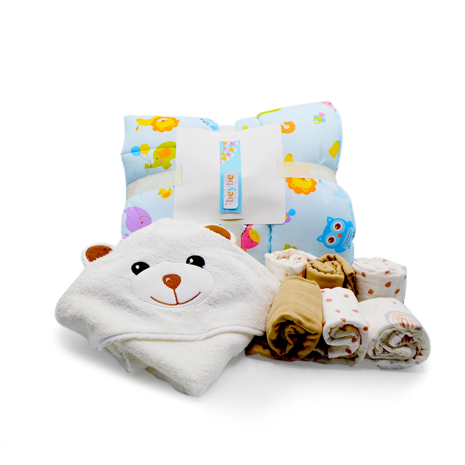 Questa Beybe Box Include: 1 Piumino per lettino 100 x 135 cm 1 Accappatoio orsetto 90 x 90 cm 6 mussole 30 x 30 cm