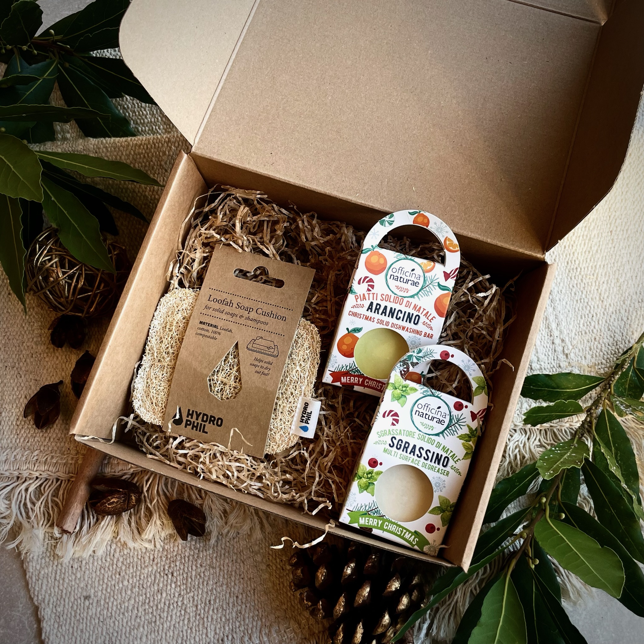 • Sapone piatti solido all’arancia (pack natalizio): Un detergente efficace e profumato, perfetto per piatti splendenti e una cucina che profuma di agrumi.