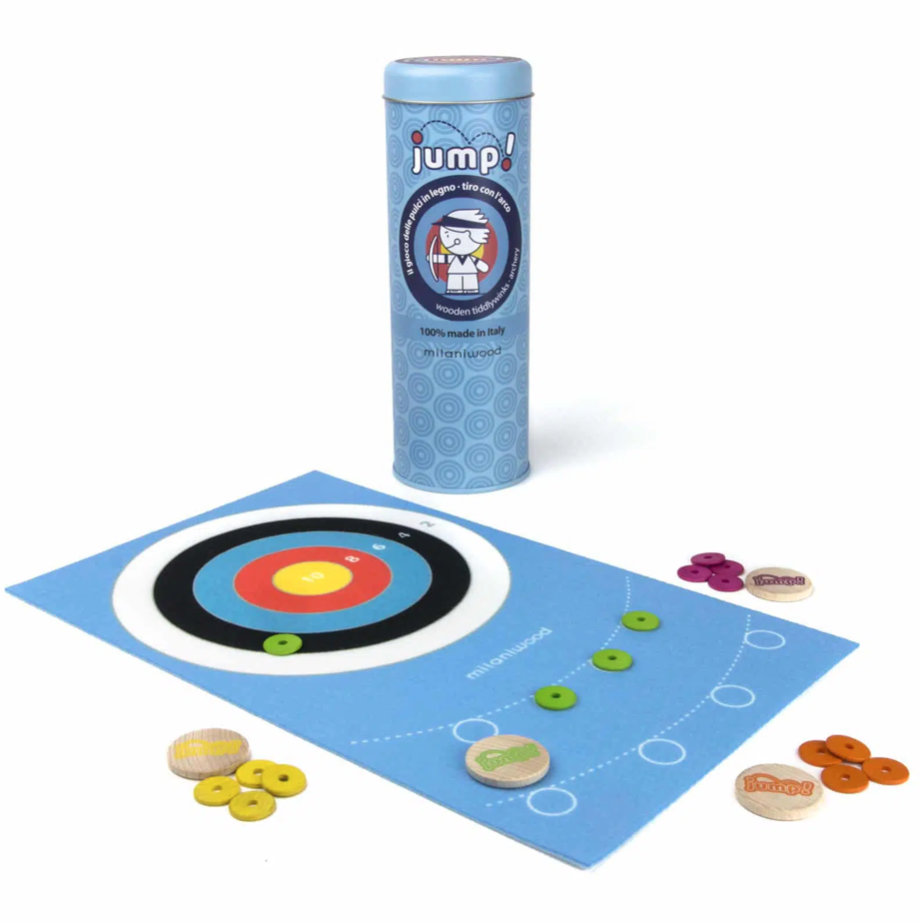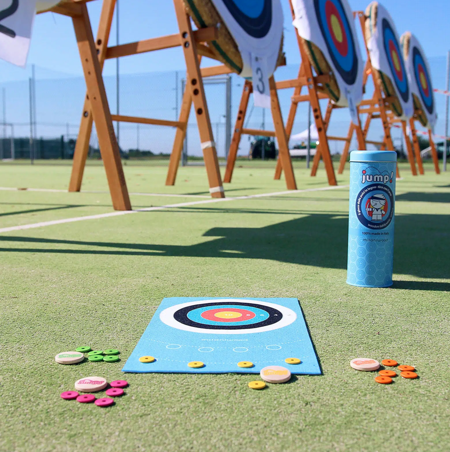 DESCRIZIONE Il TIRO CON L’ARCO diventa un gioco da tavolo in legno FSC, con il sistema di tiro del gioco delle pulci. ETA‘: 4+ GIOCATORI: 2-4 COMPONENTI 20 frecce in legno (100% FSC®), 4 dischi JUMP! in legno di faggio(100% FSC®), 1 campo con bersaglio 33×20 cm in feltro, 1 foglietto di istruzioni in 5 […]