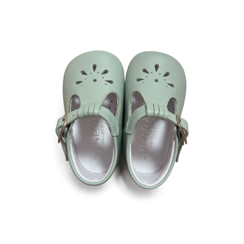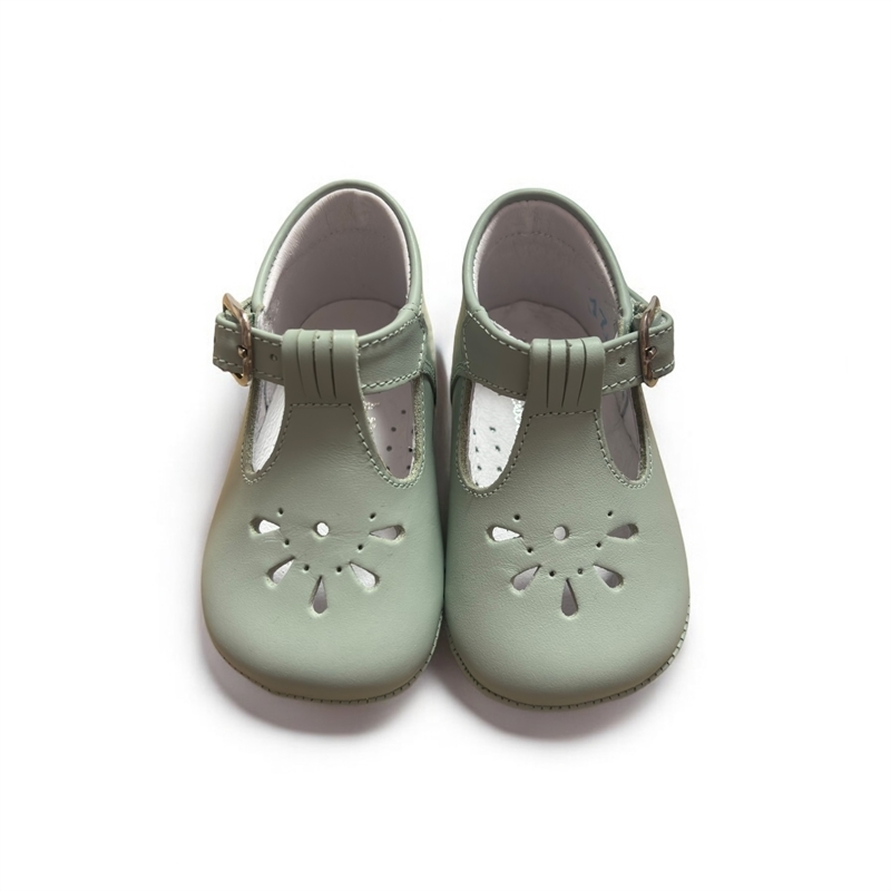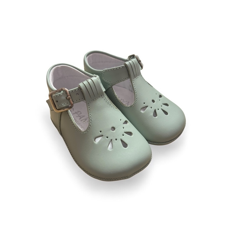 Inglesina da culla azzurra, 100% in vera pelle con forature decorative in stile chic e sobrio, cinturino con fibbia a strappo, interni foderati in pelle, suola in pelle.