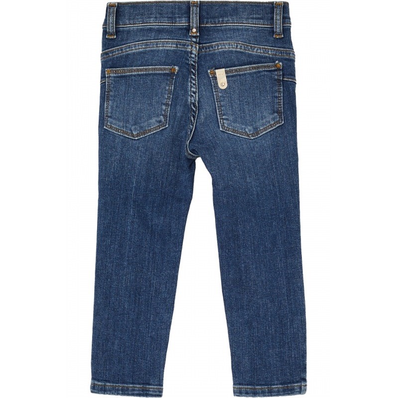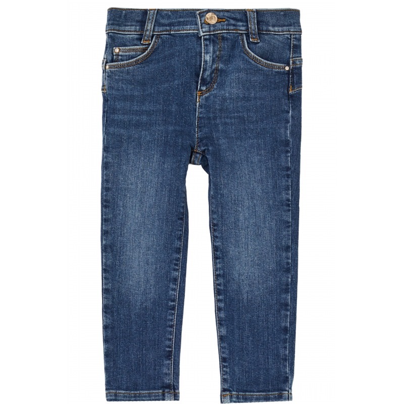 Jeans in denim di cotone stretch, vita regolare, logo ricamato sul retro, modello cinque tasche, chiusura con bottone e zip nascosta