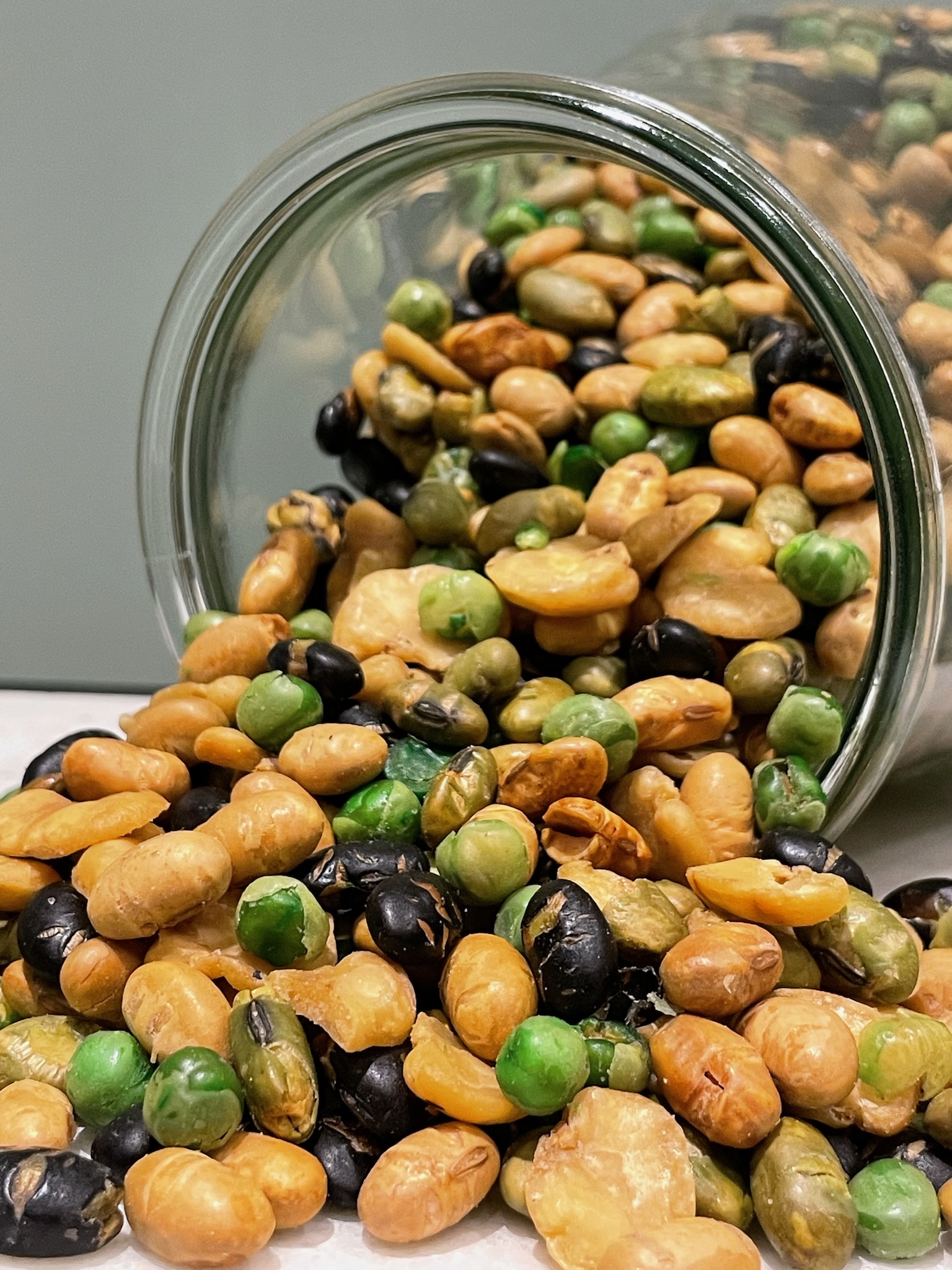 Fagioli di edamame, fagioli neri, soia, piselli verdi, fave fritte, olio, sale.