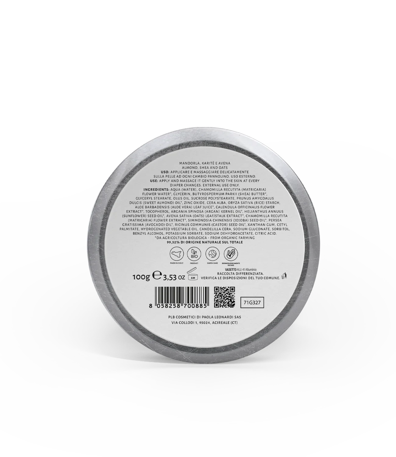 Aqua (Water), Chamomilla Recutita (Matricaria) Flower Water*, Glycerin, Butyrospermum Parkii (Shea) Butter*, Glyceryl Stearate, Olus Oil, Sucrose Polystearate, Prunus Amygdalus Dulcis (Sweet Almond) Oil*, Zinc Oxide, Cera Alba, Oryza Sativa (Rice) Starch, Aloe Barbadensis (Aloe Vera) Leaf Juice*, Calendula Officinalis Flower Extract*, Tocopherol, Argania Spinosa (Argan) Kernel Oil*, Helianthus Annuus (Sunflower) Seed Oil*, Avena Sativa (Oats) Leaf/Stalk Extract*, Chamomilla Recutita (Matricaria) Flower Extract*, Simmondsia Chinensis (Jojoba) Seed Oil*, Persea Gratissima (Avocado) Oil*, Ricinus Communis (Castor) Seed Oil*, Xanthan Gum, Cetyl Palmitate, Hydrogenated Vegetable Oil, Candelilla Cera, Sodium Gluconate, Sorbitol, Benzyl Alcohol, Potassium Sorbate, Sodium Dehydroacetate, Citric Acid. *da agricoltura biologica – from organic farming