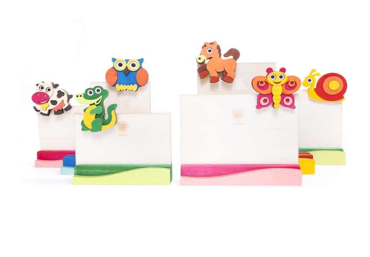 Simpatici e colorati portafoto per custodire e mettere in mostra le persone e i momenti più importanti della vita. Gli animali sono rimovibili e intercambiabili. Disegno e produzione propria. 100% Made in Italy. Materiale certificato. Prodotto con energia derivata da fonti rinnovabili. Materiali: legni di pioppo e abete – plexiglass Dimensioni: cm 14×15 Formato foto: […]