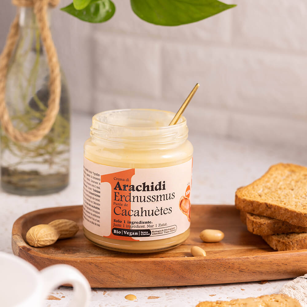 DESCRIZIONE Solo arachidi biologiche selezionate, tostate e macinate per ottenere una crema dalla consistenza vellutata e un gusto intenso e naturale. Ricca di fibre e fonte di proteine, è un ingrediente prezioso per chi segue un’alimentazione equilibrata, senza glutine e 100% vegana. Perfetta per la colazione, nelle bowl di yogurt o spalmata sul pane, la […]