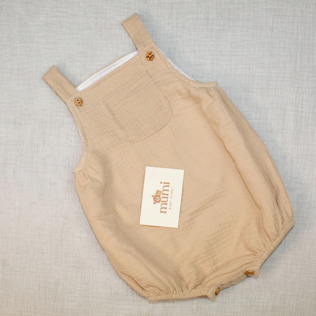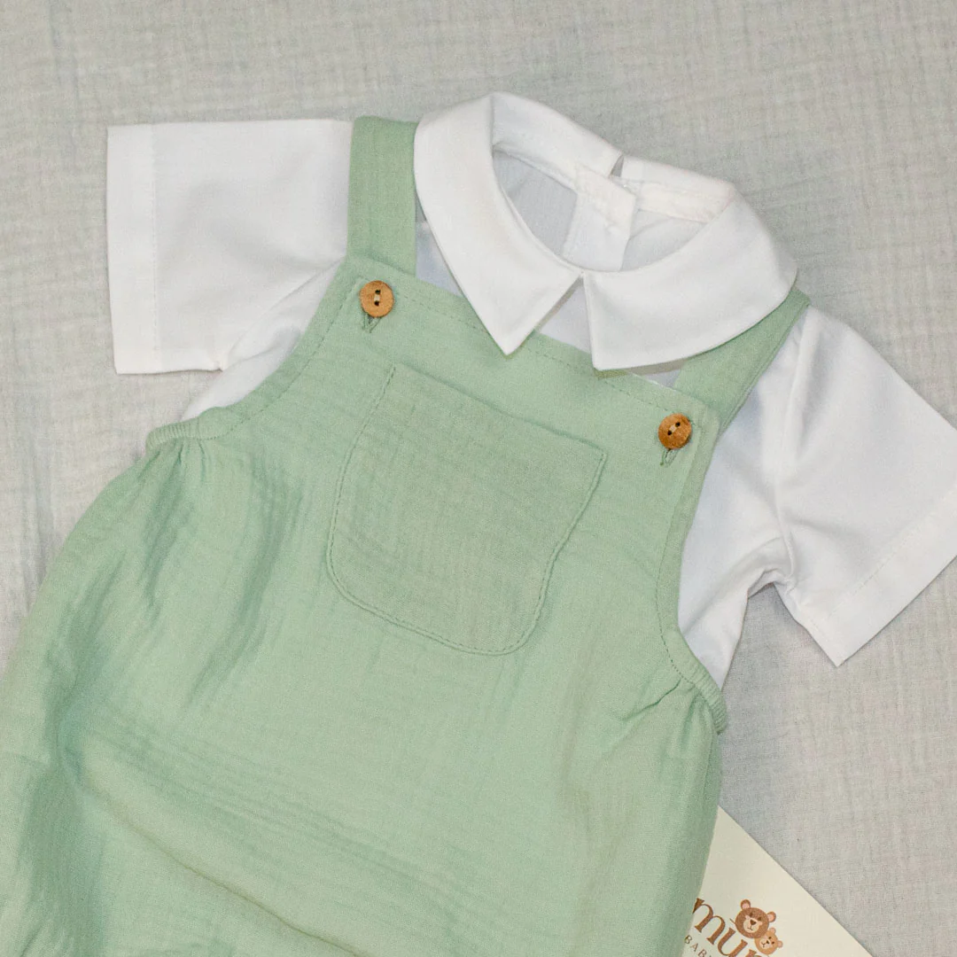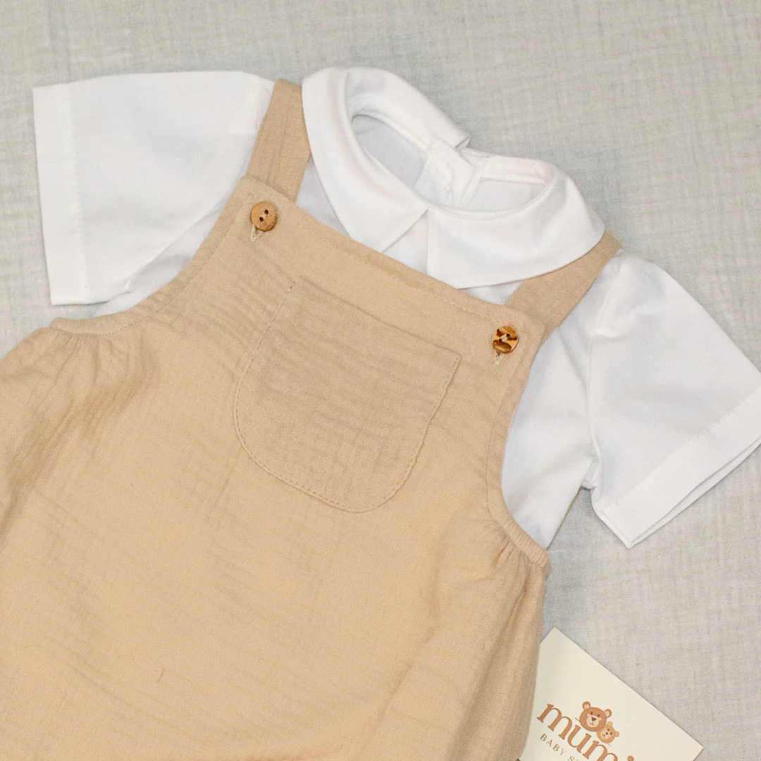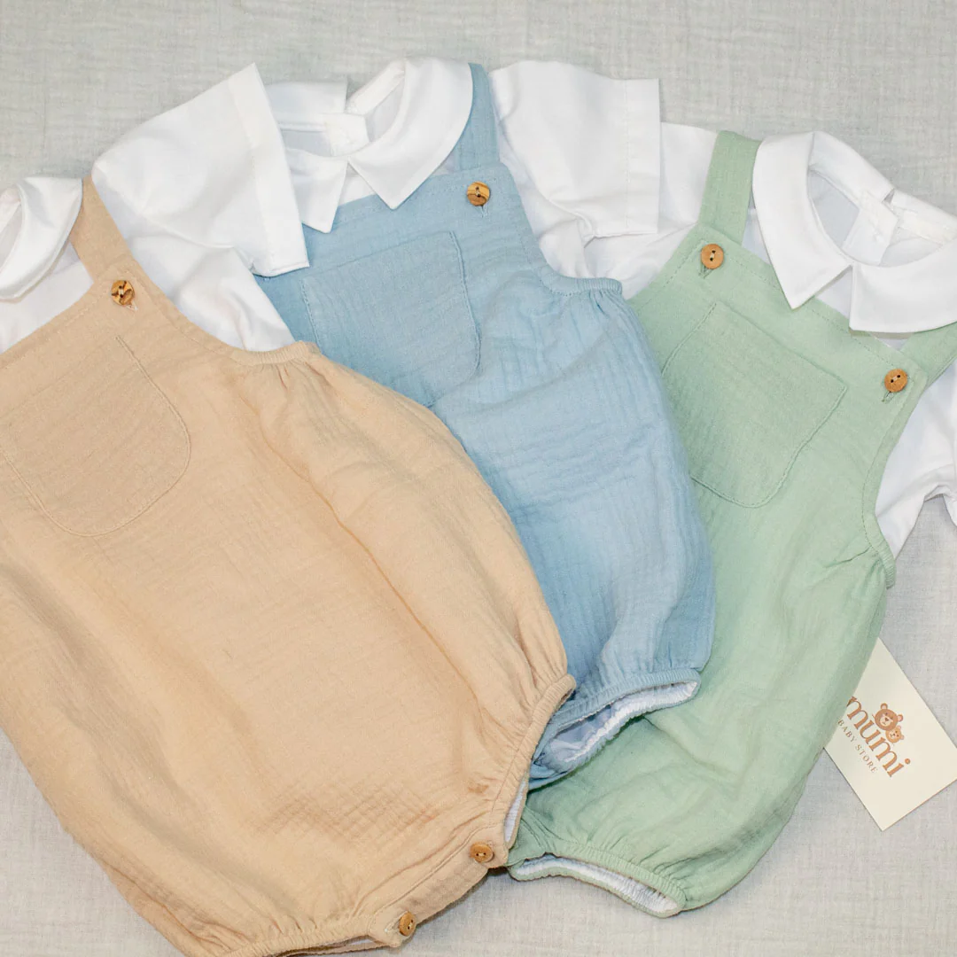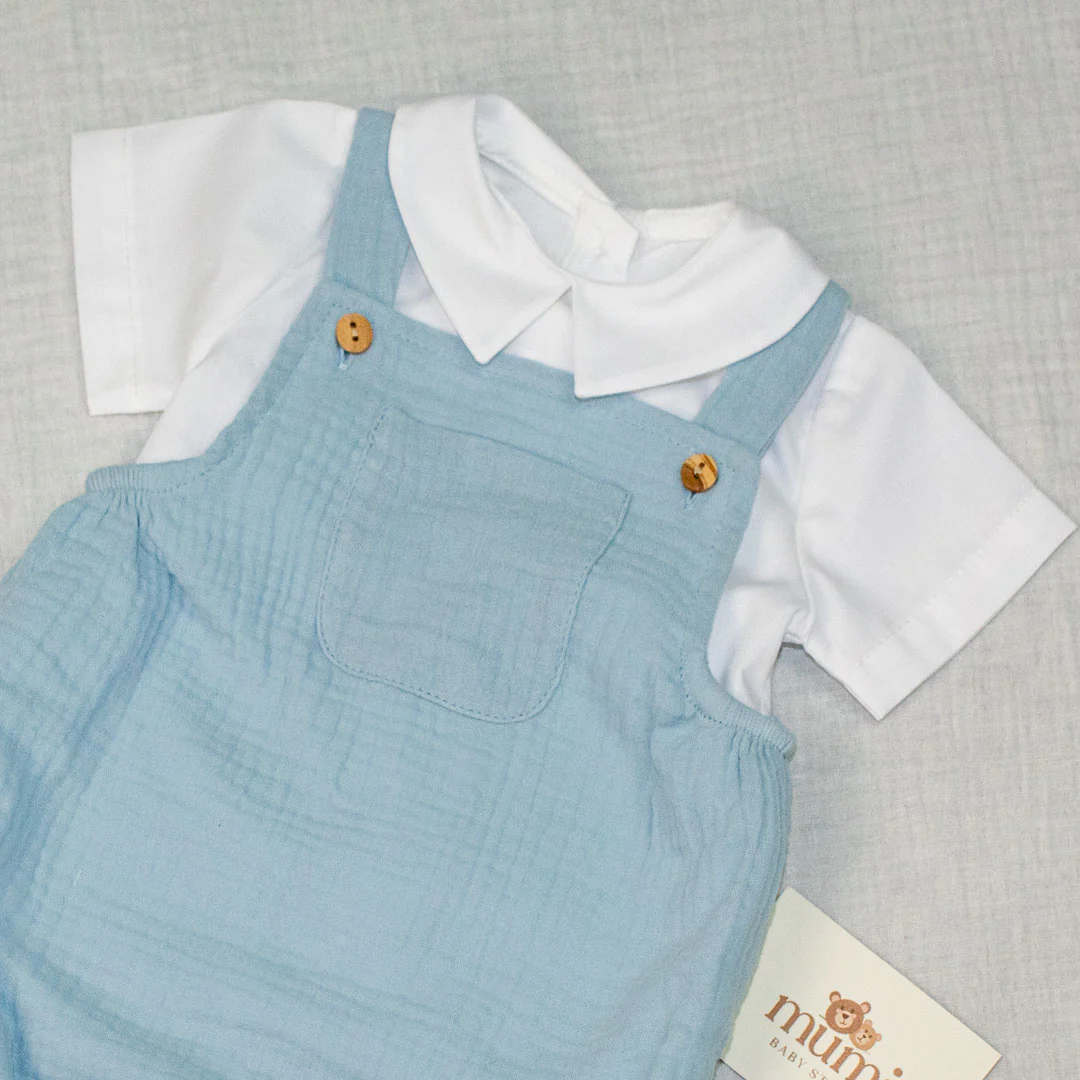 Salopette in morbido tessuto di mussola di cotone con camicia a maniche corte .Tessuto leggero e traspirante perfetto per le calde giornate estive.