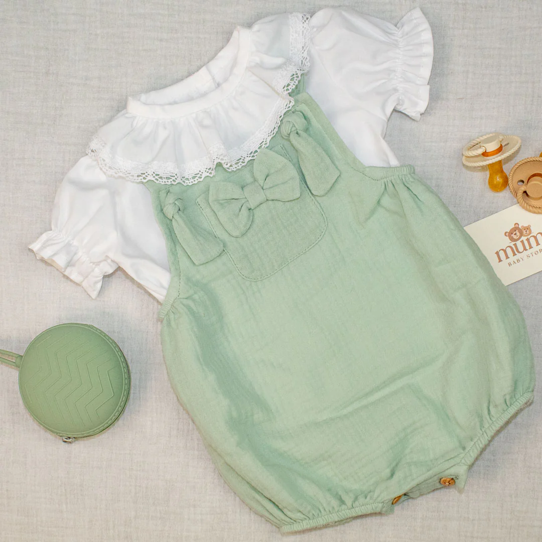 Salopette in morbido tessuto di mussola di cotone con camicia a maniche corte con colletto ricamato.Tessuto leggero e traspirante perfetto per le calde giornate estive.Il tessuto morbido e delicato per la pelle è molto confortevole per i bambini fin dai primi giorni di vita.Chiusura con bottoni in legno tra le gambe per un facile cambio […]