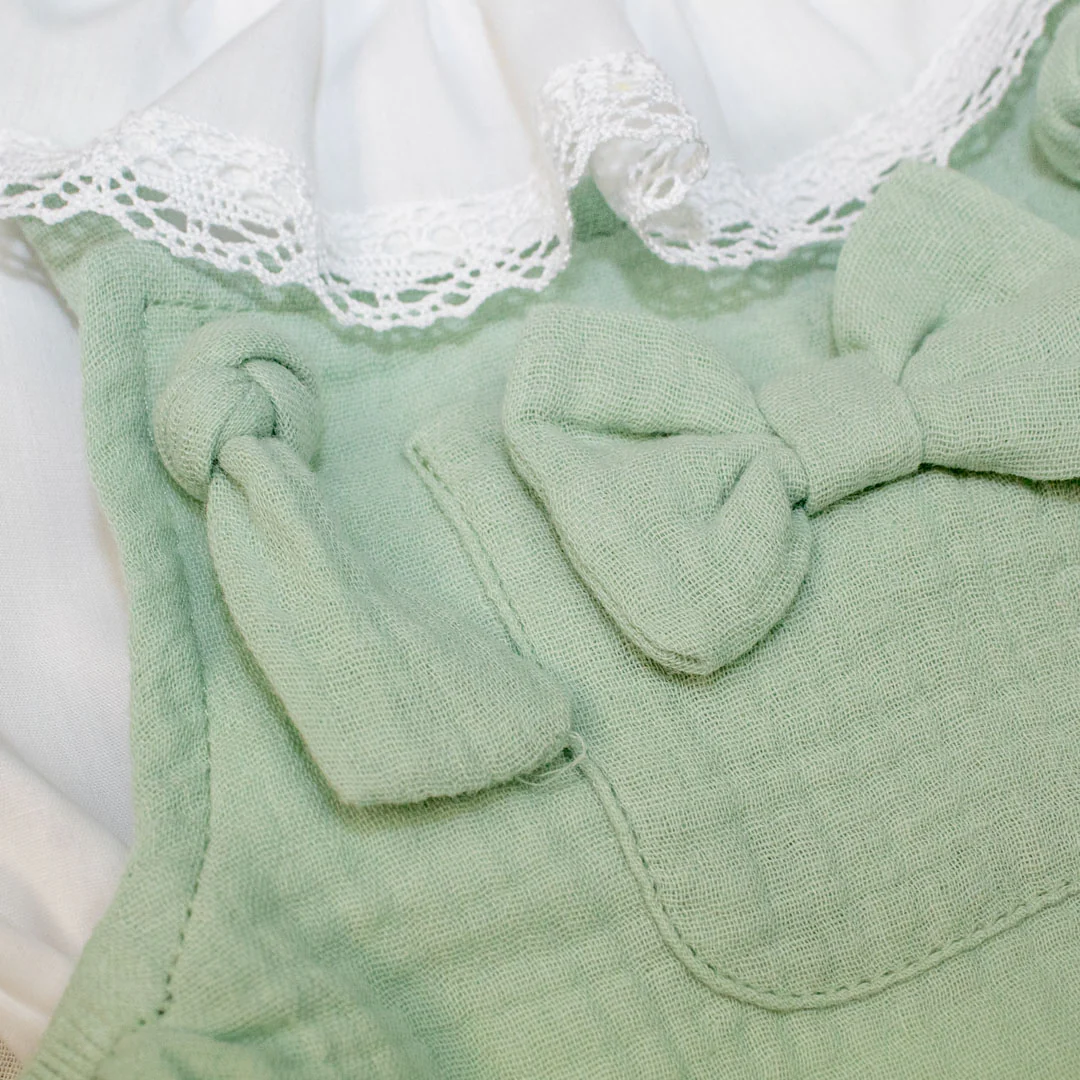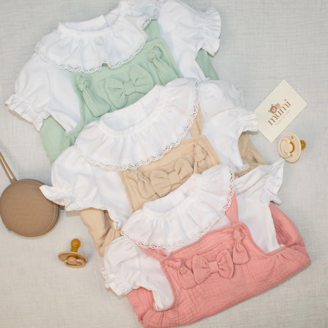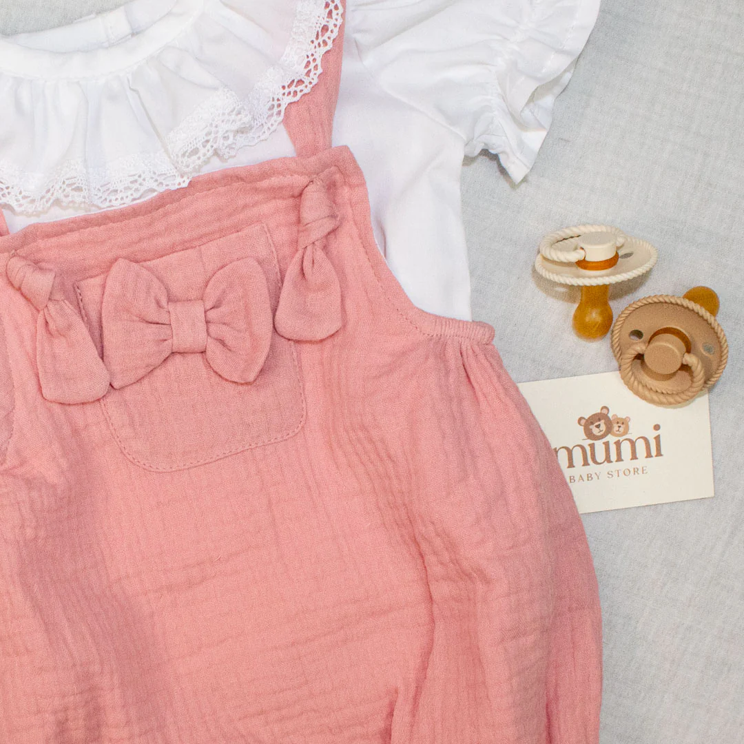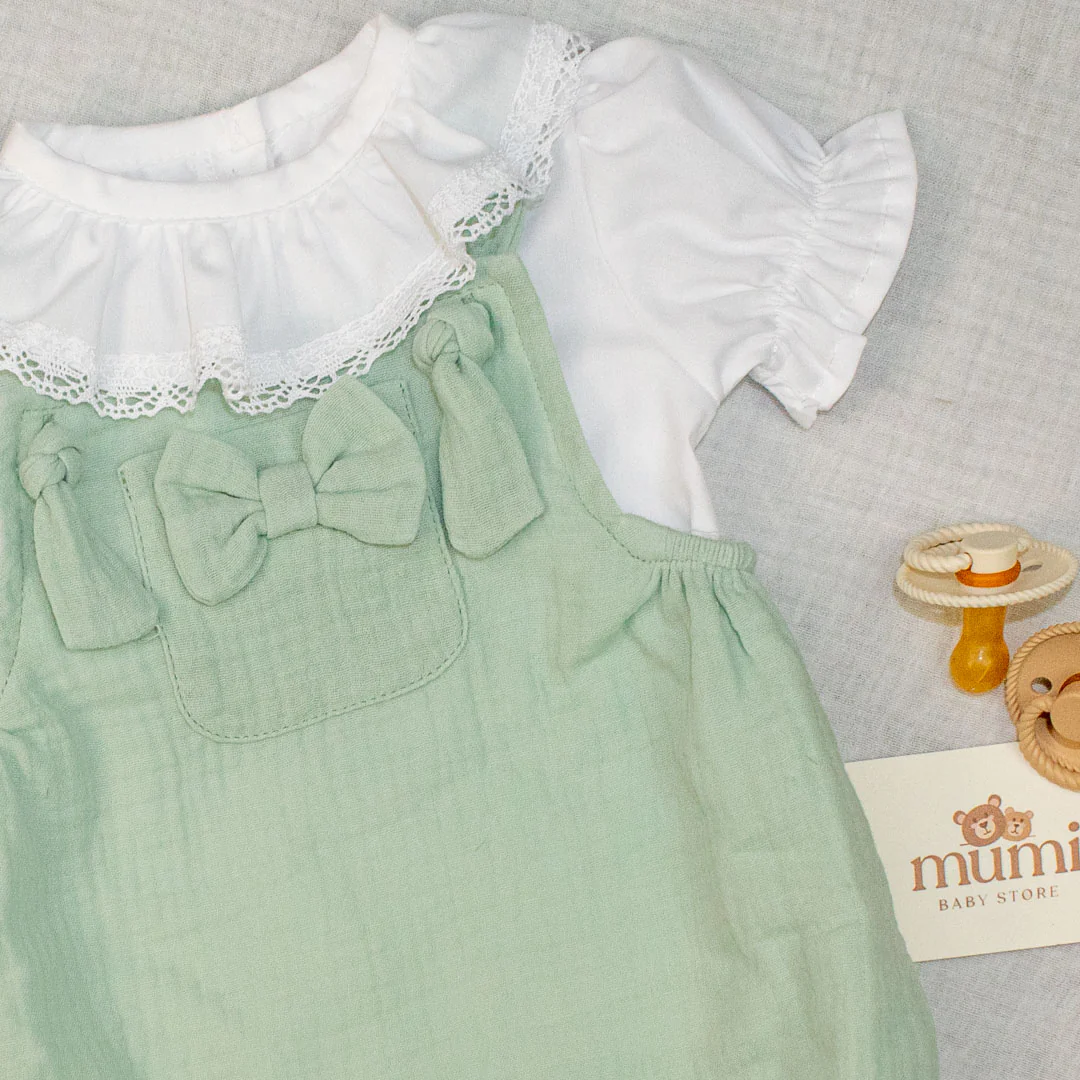 Salopette in mussola di cotone e camicetta ricamata