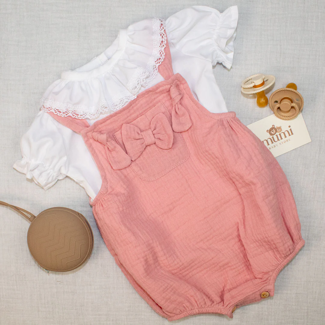 Salopette in morbido tessuto di mussola di cotone con camicia a maniche corte con colletto ricamato.Tessuto leggero e traspirante perfetto per le calde giornate estive.