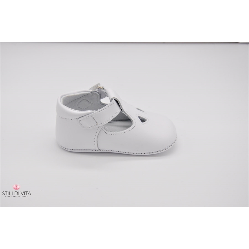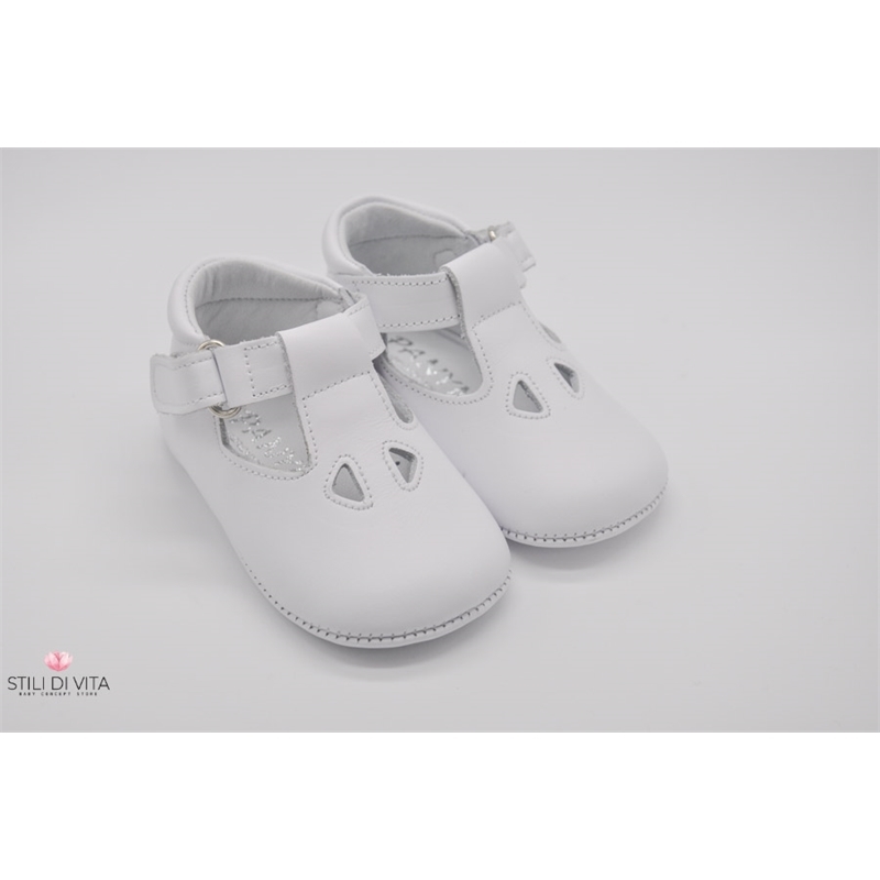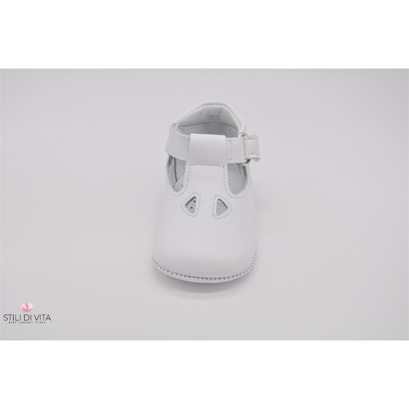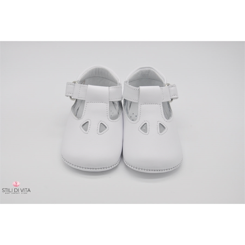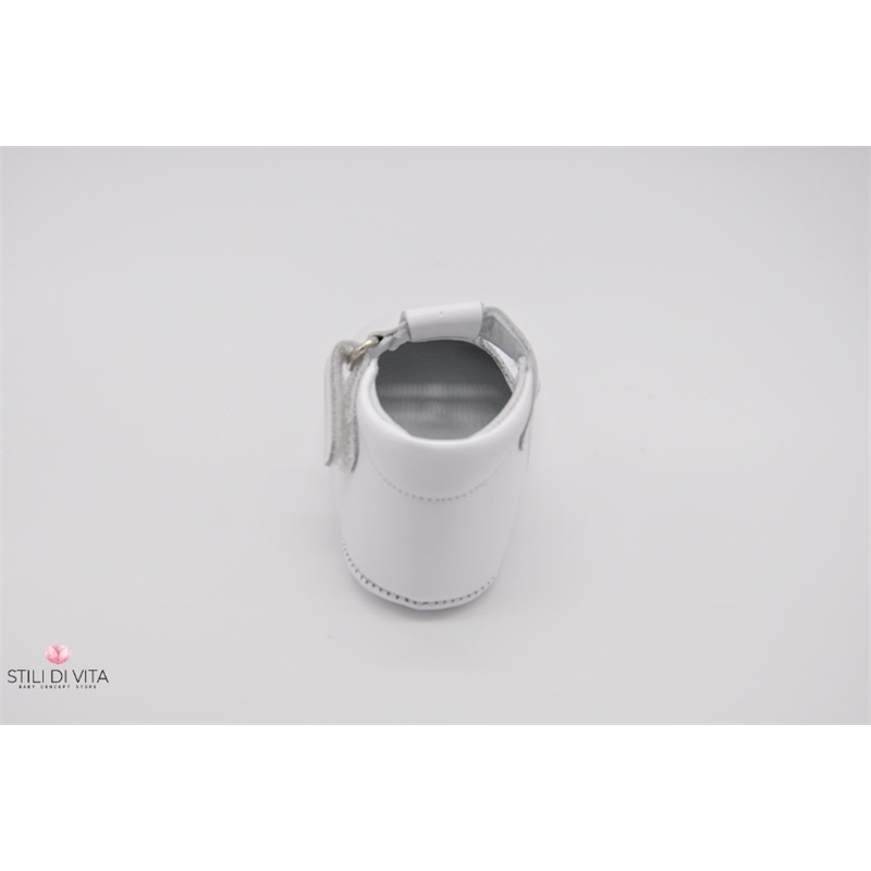 Scarpette da culla 100% in vera pelle con occhietti decorativi, cinturino con fibbia a strappo, interni foderati in pelle, suola in pelle.