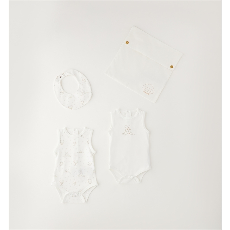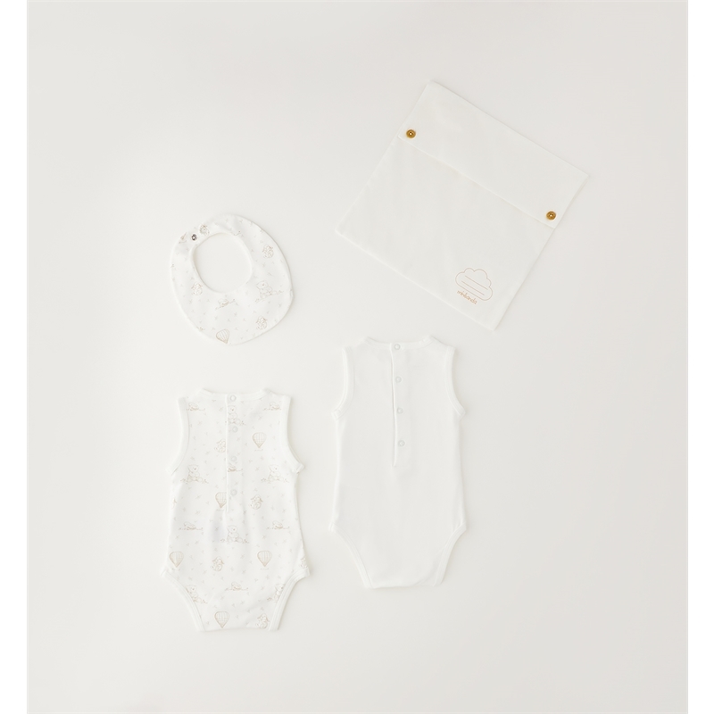 Set accessori nascita in cotone composto da busta porta corredino, 2 body smanicati e bavetta. Fantasia delicata con orsetti, coniglietti e mongolfiere.