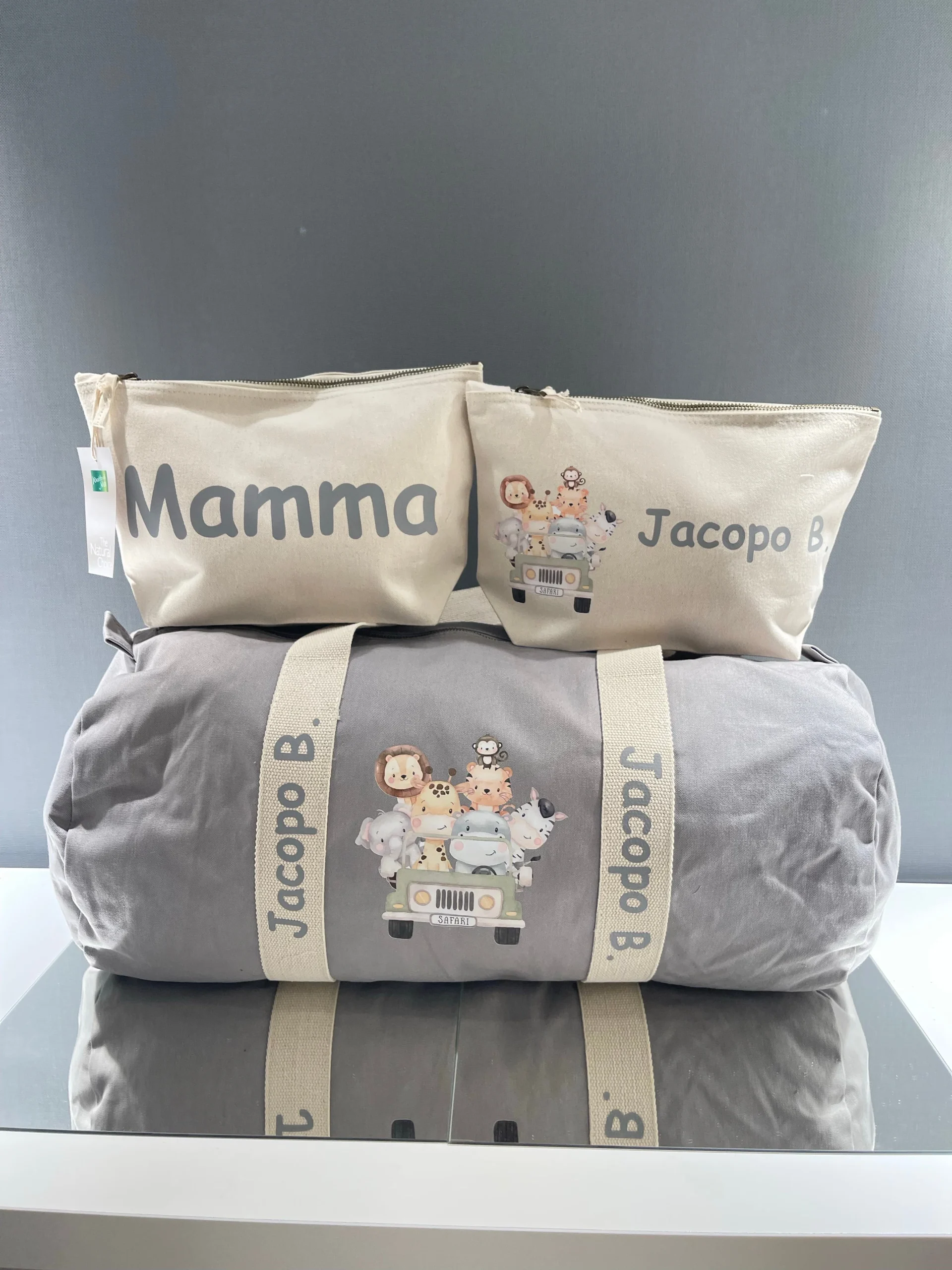 Set Borsone Baby, 2 beauty case e 3 sacchi stampa Safari personalizzati con nome