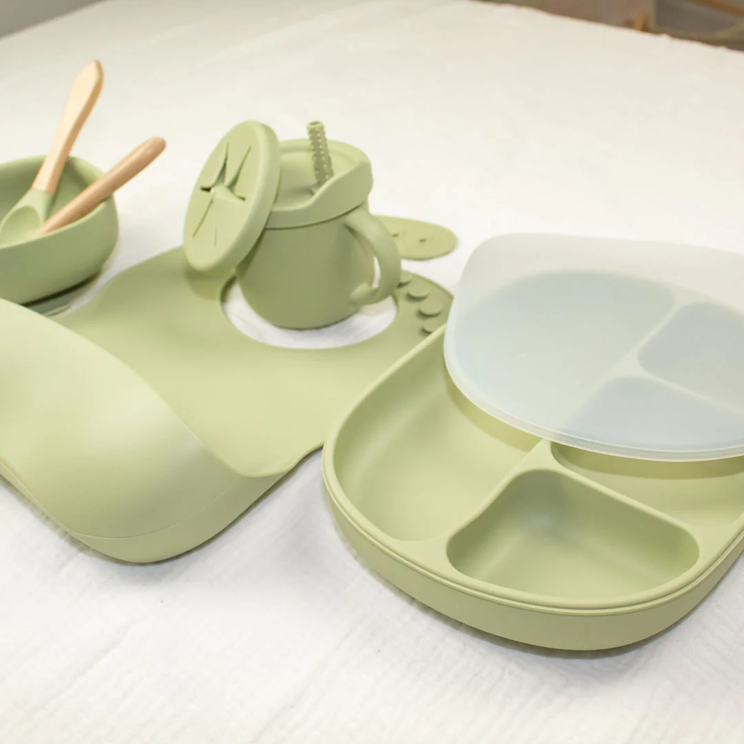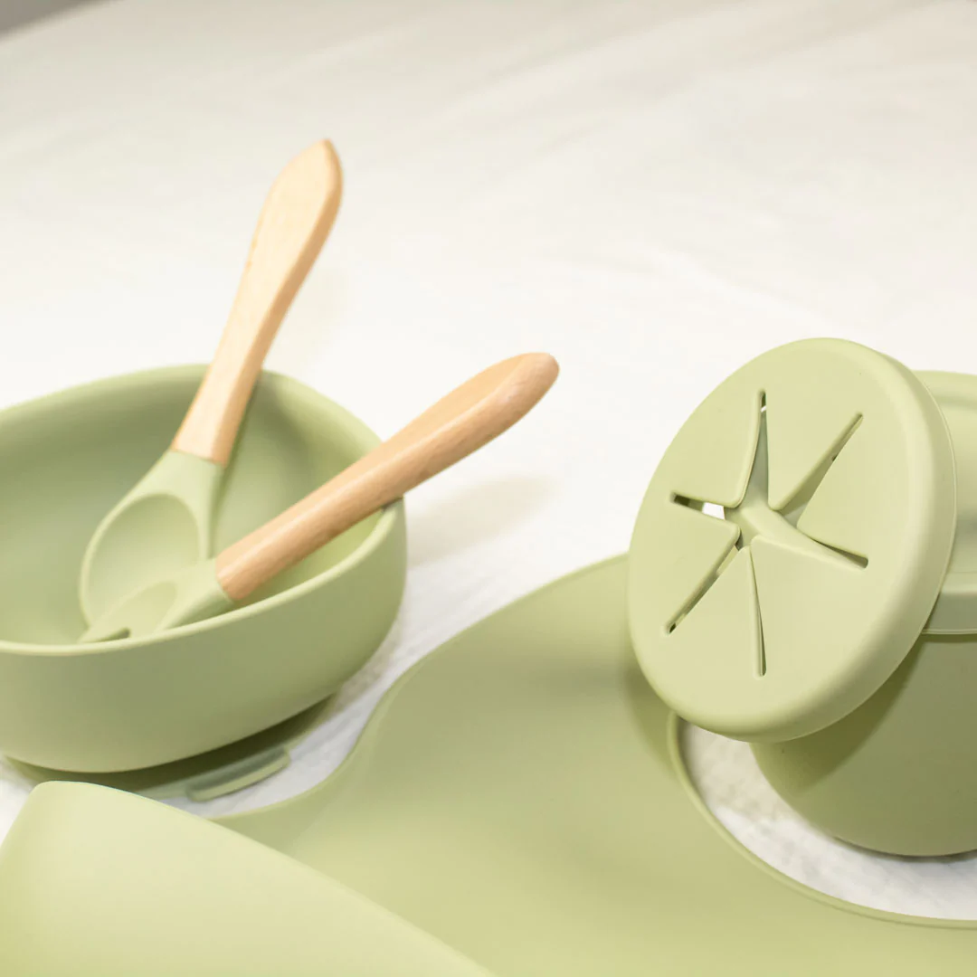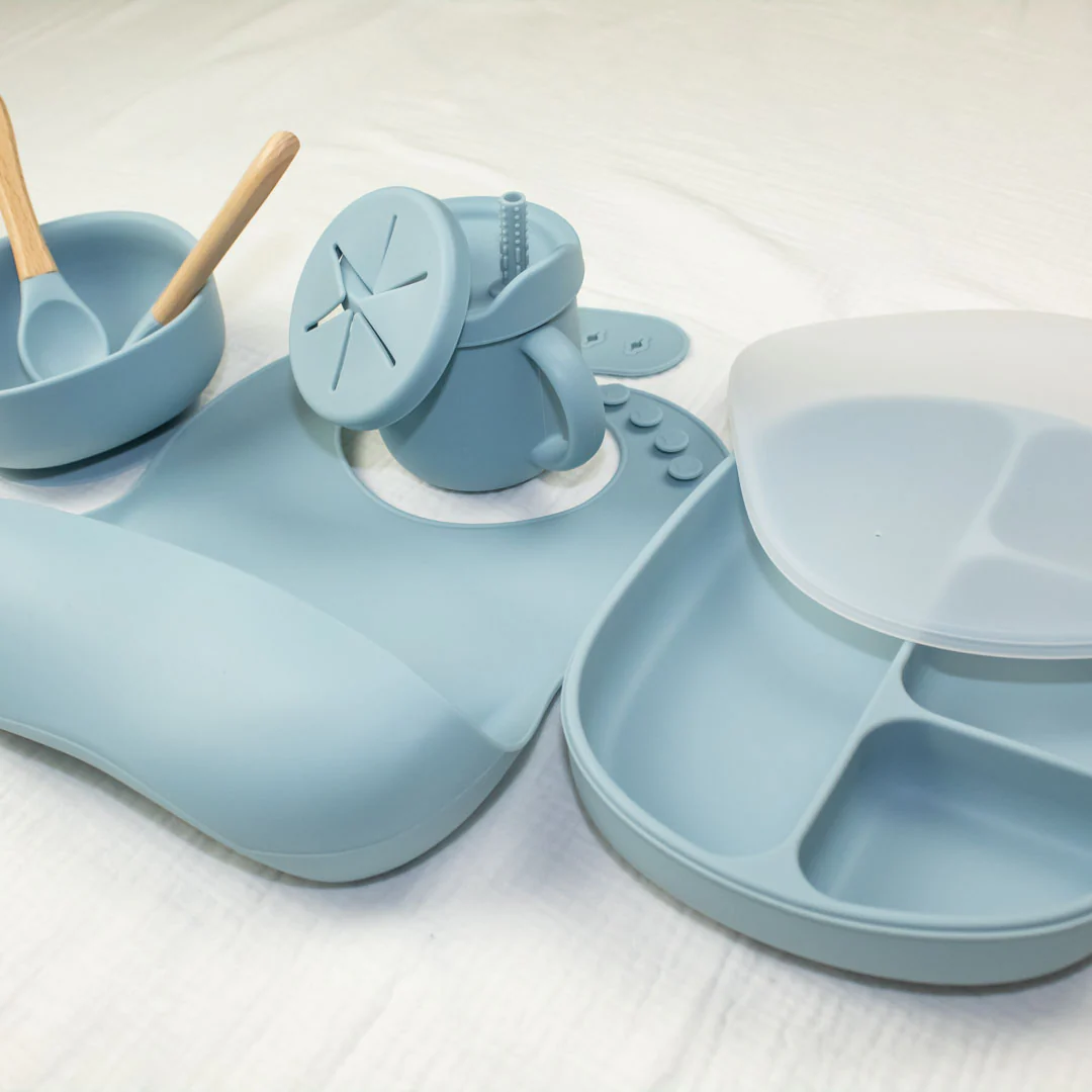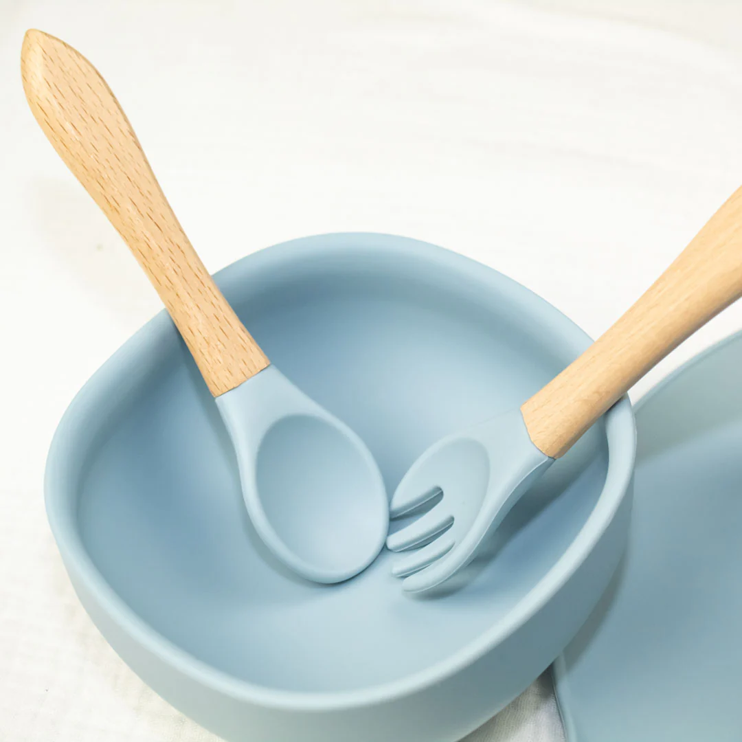 Il Set Pappa Bambino – Azzurro Polvere è realizzato in silicone morbido, flessibile, resistente e leggero. Ottimale per il contatto con gli alimenti: il silicone è resistente ai batteri, il che li rende extra igienici!
