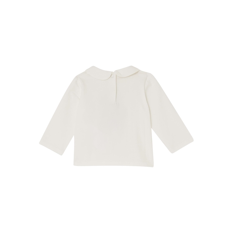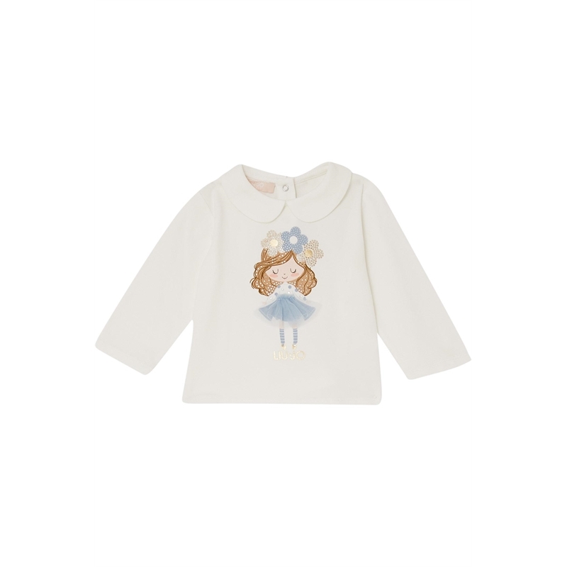 T-shirt in jersey di cotone stretch, stampa grafica con strass e logo, taglio girocollo, maniche lunghe